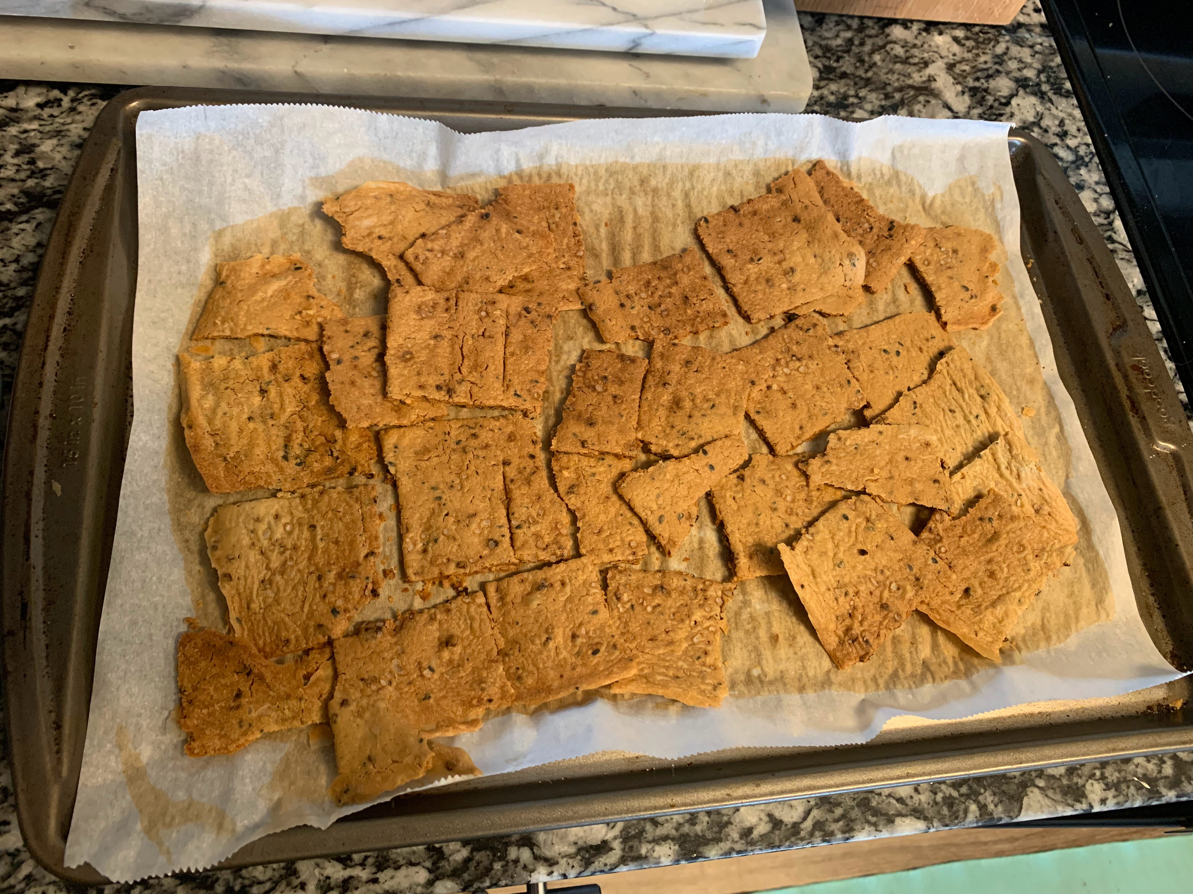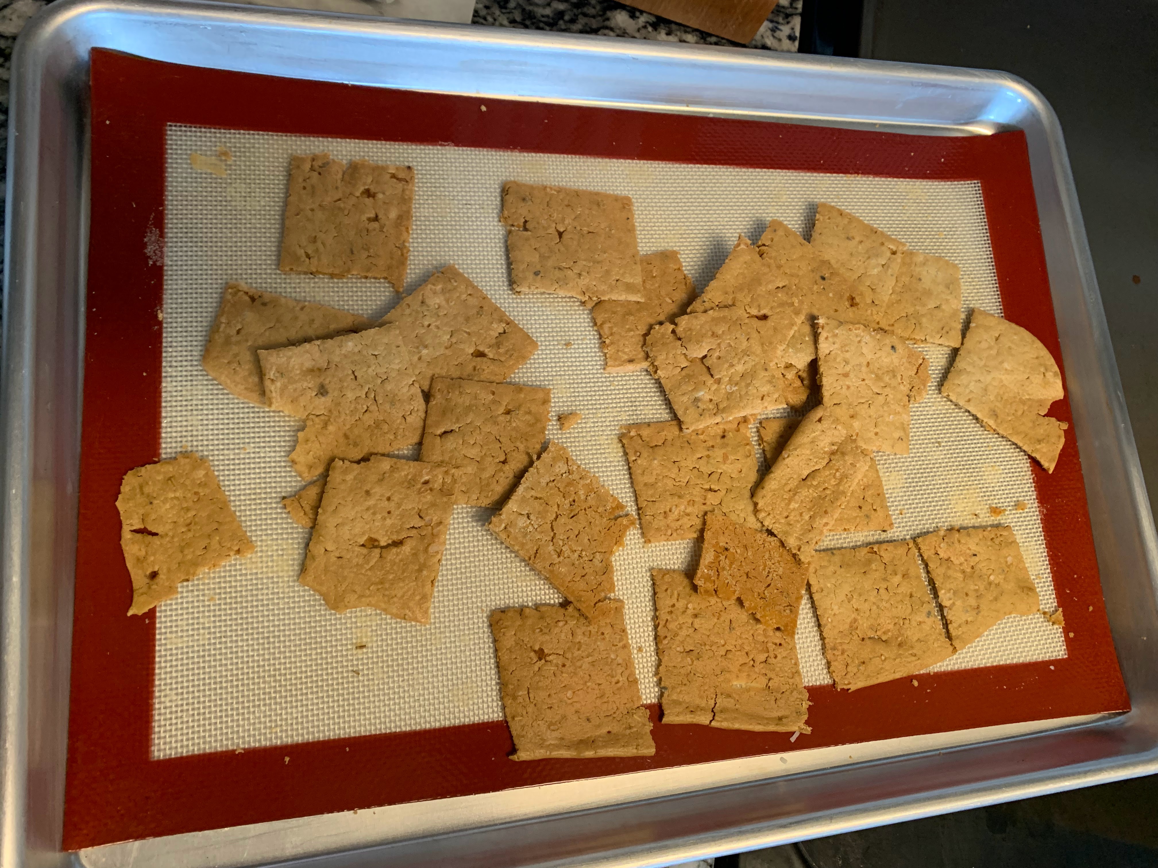 Now a few tidbits about this if you go about making your own. In the instructions, the author says to use parchment paper, but a commenter used a silicone baking mat. Since I had enough for two batches, I decided to try both options out and see what I liked best. Personally, I love parchment paper. Quick, easy, and mess-free. However, when it came to these crackers, the silicone baking mat worked a lot better in my opinion. I will also say that everything but the bagel ones may have cooked a minute longer than needed, so that might also affect my opinion. Either way, both options worked perfectly fine if you don’t have a silicone baking mat.